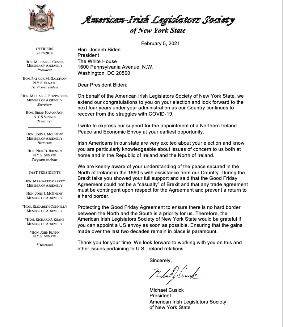 "Protecting the Good Friday Agreement to ensure there is no hard border between the North and the South is a priority for us. Therefore, the American Irish Legislators Society of New York State would be grateful if you can appoint a US envoy as soon as possible. Ensuring that the gains made over the last two decades remain in place is paramount."