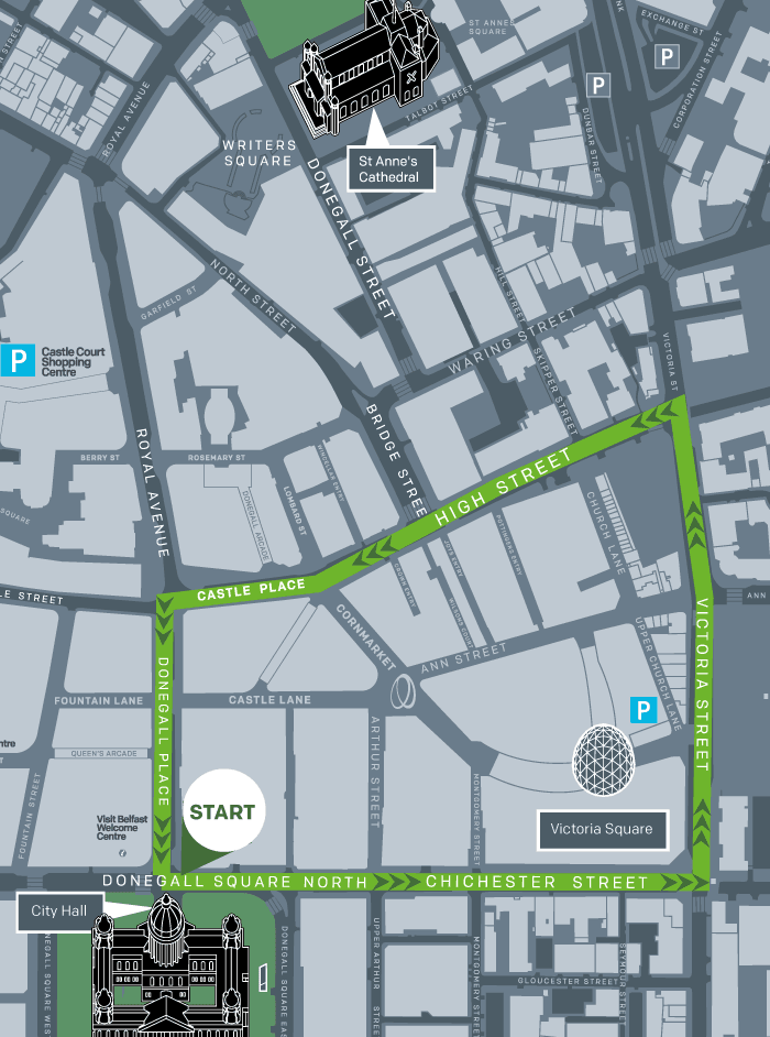 There will be no on-street parking, including blue badge spaces, from 6am to 3pm along Donegall Place, High Street and Bridge Street.