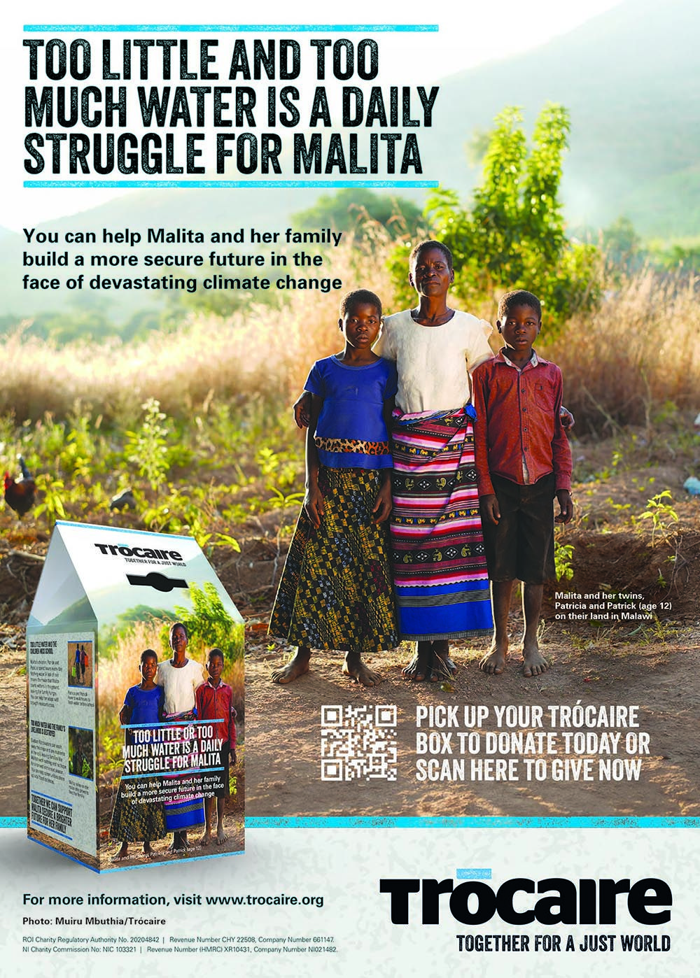 This year’s Trócaire Box tells the story of one Malawian family who are struggling to survive. Living in a small homestead in southern Malawi, Malita, mother of six children, including 12-year-old twins Patricia and Patrick, feature on the front of the 2024 Trócaire box.