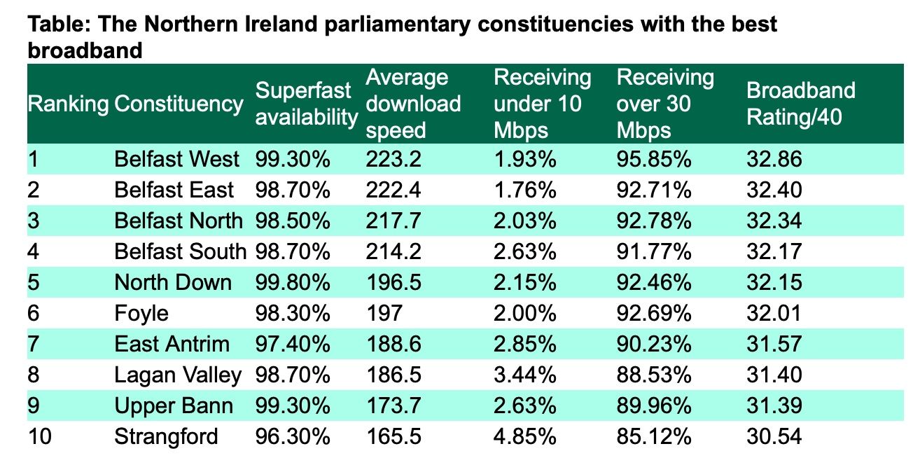 Belfast West topped the study as the top parliamentary constituency in the North with the best broadband.