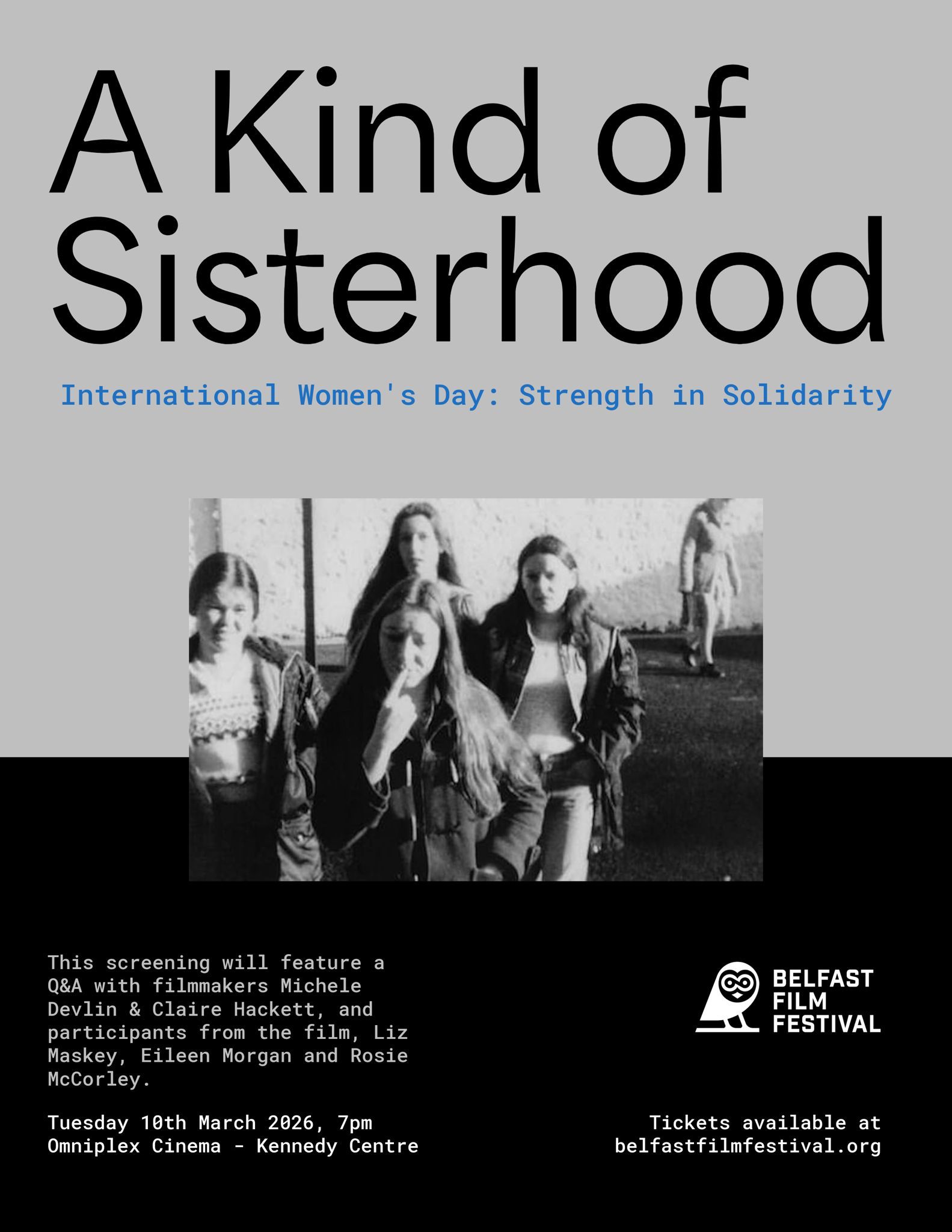Belfast Film Festival will presents a special screening of 'A Kind of Sisterhood' (2015), a documentary about women prisoners in Armagh and Maghaberry prisons, followed by a Q&A session with directors Claire Hackett and Michele Devlin and participants, Liz Maskey, Eileen Morgan and Rosie McCorely.