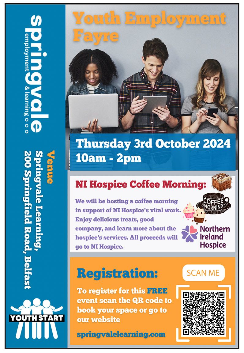 Springvale Learning are holding a Youth Employment Fair on 3 October at 10am at Springvale Learning, 200 Springfield Road, Belfast, BT12 7DR.